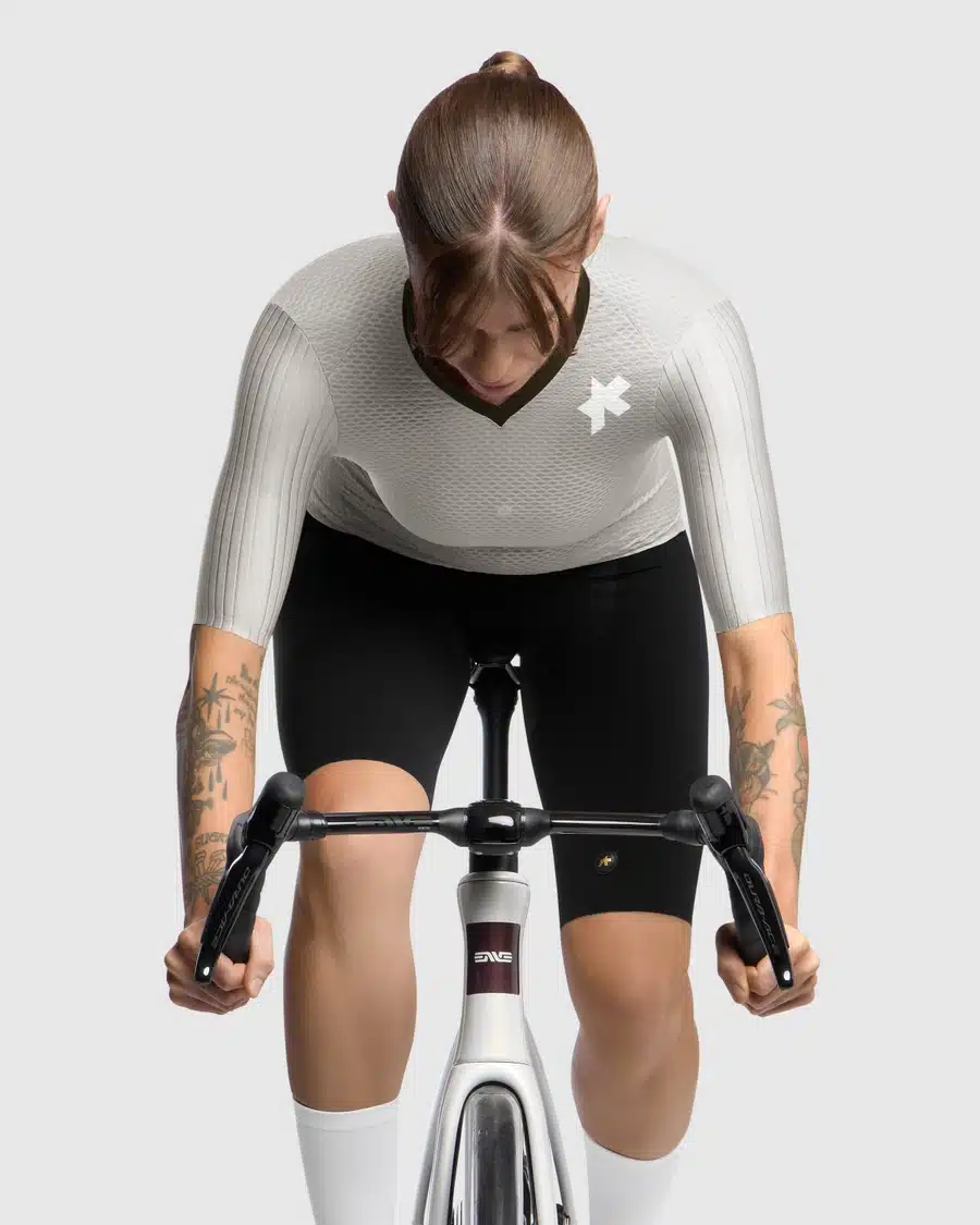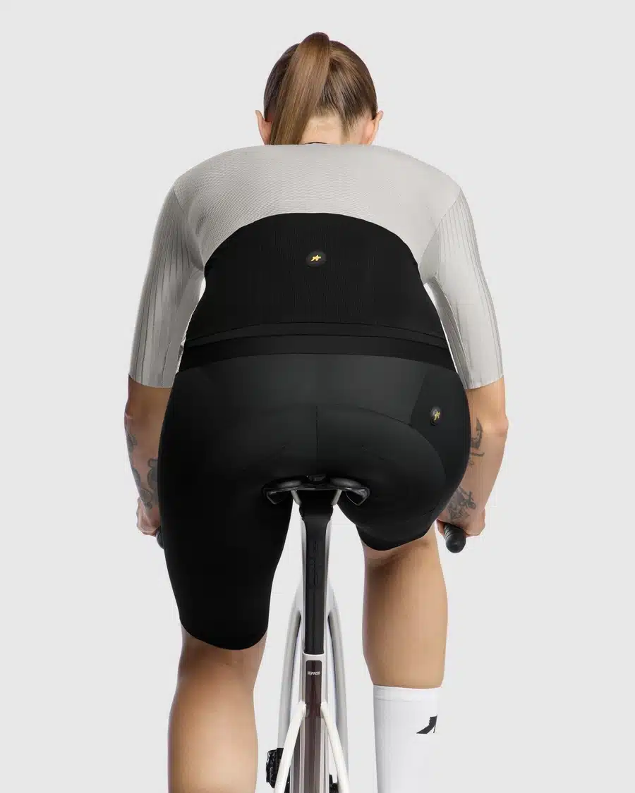 Die einteilige Torsokonstruktion verhindert Faltenbildung und umhüllt den Oberkörper mit der ultimativen, aerodynamischen Second-skin-Passform.
